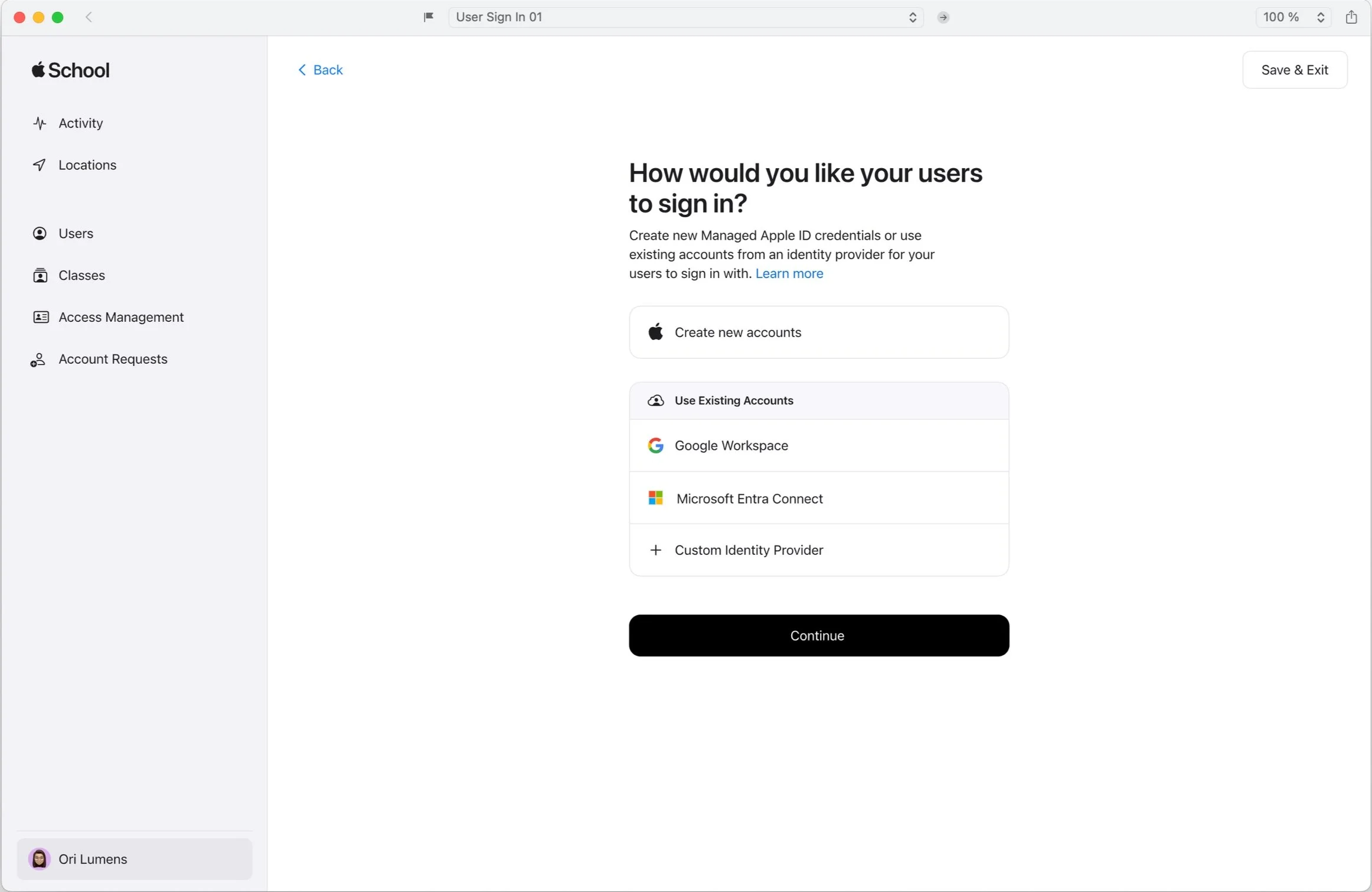 By integrating IDP into the sync setup, the flow now included two key decisions: selecting your directory source (SIS, CSV, etc.) and choosing how users would sign in (default Managed Apple Accounts or connected IDP). Logically, it made sense to select the directory source first, since those imported users would then need a sign-in method assigned.