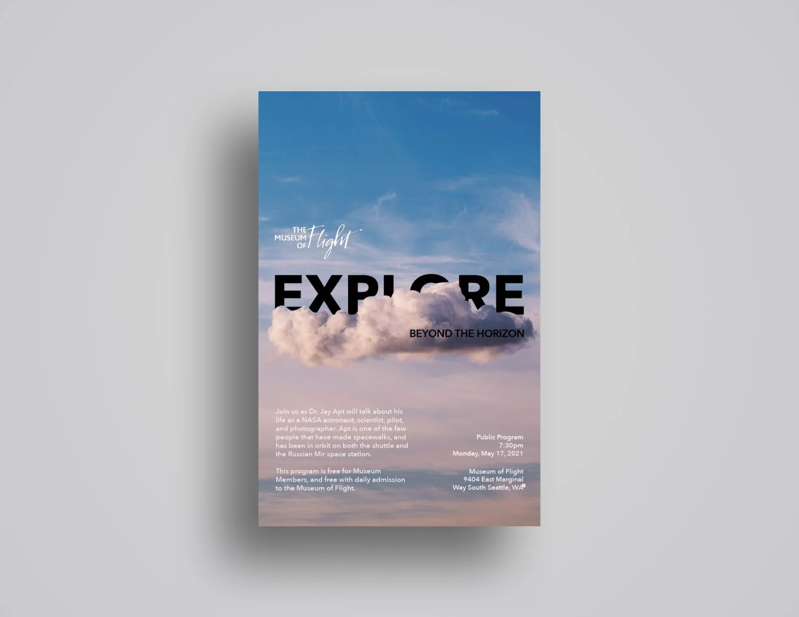 This poster was designed for the Museum of Flight in Seattle, advertising the public event, Explore: Beyond the Horizon.